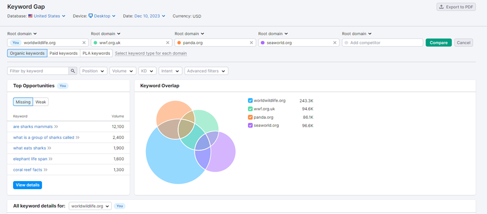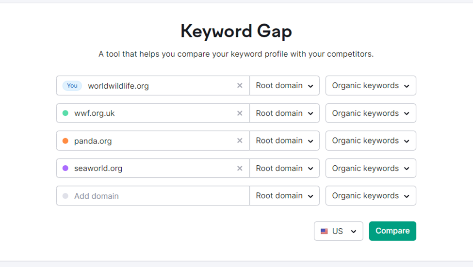 The keyword gap analysis is also easy to use by simply adding your domain and competitors’ domains:
