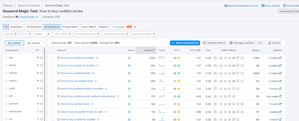 SEMrush takes the cake for keyword suggestions and analysis, though it’s also good for competitive analysis, off-page SEO, on-page site audits, and more. I like their Social Media Toolkit, especially because social media signals help optimize your content strategy, too.
