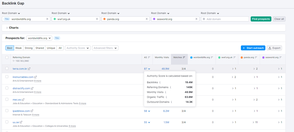 You can then move on to backlink analysis, looking at your prospective link partners. SEMrush helpfully organizes them as best, weak, strong, shared, and all.