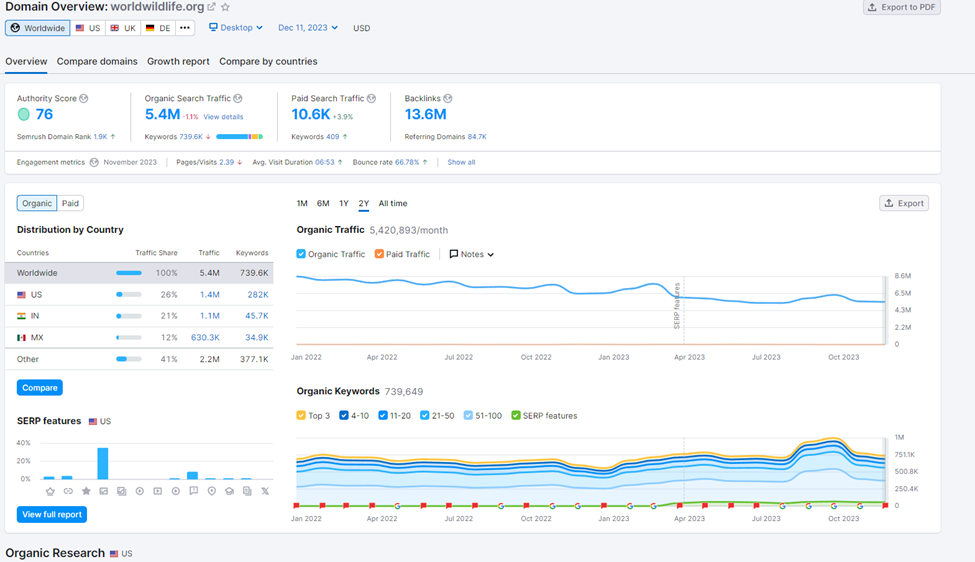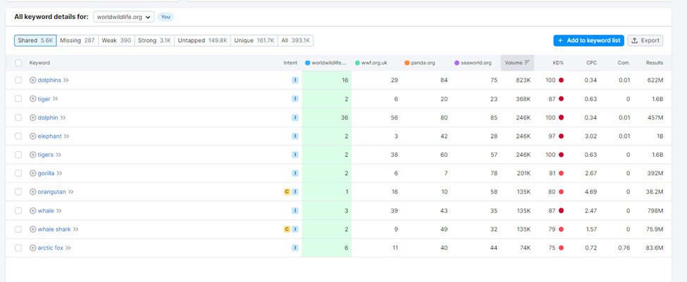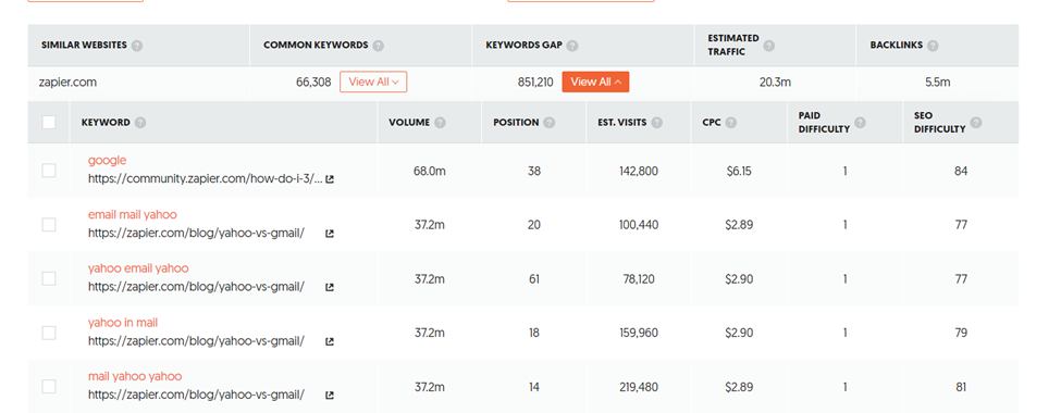 This shows you the organic traffic, common keywords, keyword gap, estimated traffic, and backlinks for websites similar to yours.